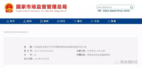 3月28日,国家市场监督管理总局网站发布“市场监管总局关于征求调整保健食品保健功能意见的公告”,公告提到,为加强保健食品保健功能声称管理,避免与药品疾病预防和治疗作用混淆,特组织医学、药学、食品、营养等领域专家进行多次论证,研究提出了调整保健功能的意见。