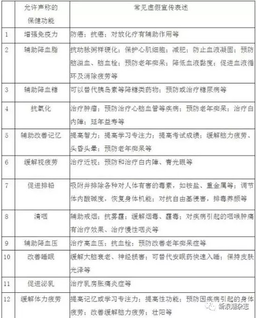 据本公号“新浪潮杂志”此前报道,2018年9月27日,国家市场监督管理总局发布“关于防范保健食品功能声称虚假宣传的消费提示”。其中以列表对照的形式对各个类别中可能出现的夸大宣传一一作了明示。比如,“促进消化”被演绎成“治疗胃胀、胃痛”等,“改善睡眠”被说成能“缓解大脑衰老、神经损害;可替代安眠药快速入睡;保持皮肤光泽”等。更甚者,“增强免疫力”被演绎成“防癌,抗癌”,“改善发育”被简化成更易传播的“增高”。