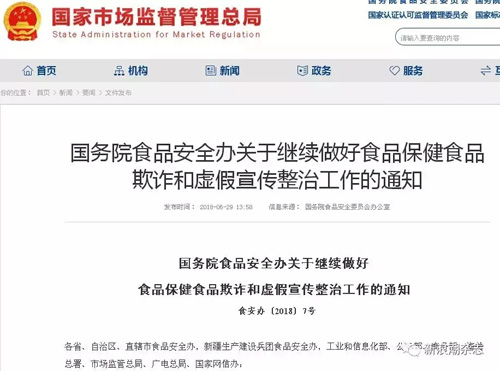 在2018年的6月29日,国家市场监督管理总局网站公布《国务院食品安全办关于继续做好食品保健食品欺诈和虚假宣传整治工作的通知》。《通知》称:为进一步巩固整治成果,更好净化消费环境,现将整治工作延至2018年底,分为持续推进(6—8月)、抽查检查(9—10月)、总结评议(11月)三个阶段。其中提到,要严厉查处虚假标识标签和虚假广告,以及以健康养生讲座、专家热线等形式进行虚假宣传等违法违规行为。