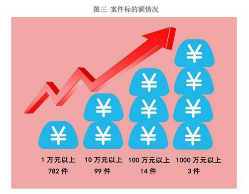 三是案件标的额上升明显。2018年电子商务案件平均标的额比2017年上升49172元达到68184.29元。标的额在1000万元以上的案件有3件,100万元以上的有14 件,10万元以上的有99件,1万元以上的案件有782件(见图三)。除了网络服务合同纠纷容易产生大标的额案件外,网络购物纠纷也出现了许多大标的额的案件,如某买家网购一全球知名纯电动品牌汽车引起的合同纠纷案标的额达132.67万。