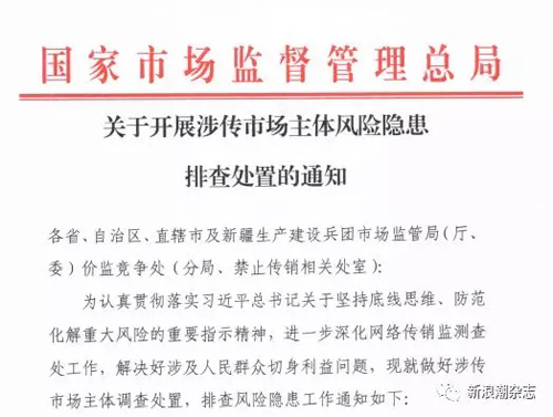 “以2017-2019年监测发现的涉传线索为重点,各地要进行逐一排查、核实、分类处置,消除可能存在的风险隐患。”近日,国家市场监督管理总局价监竞争局(规范直销与打击传销办公室)向各地下发的“关于开展涉传市场主体风险隐患排查处置的通知(下简称‘通知’)”中这样要求。