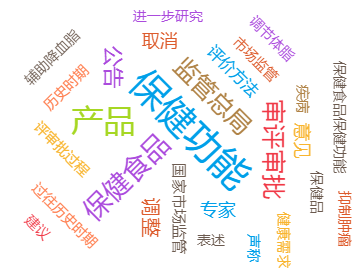 根据词频分析,媒体关注集中在保健功能、保健食品、审评审批、监管总局等热词。多数媒体以转载公告内容为主,因此“国家市场监管总局”“调整”“取消”“进一步研究”等公告内容成为新闻传播的关键词。