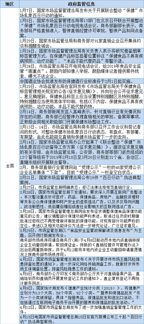 1月8日,国家市场监督管理总局等13个部门联合部署“百日行动”,整治“保健”市场出现的虚假宣传、违法广告、消费欺诈、假冒伪劣等一系列突出问题,随即在全国各省市掀起了整治保健品乱象风暴。中国直销大数据研究中心整理了百日行动期间(1月8日-4月18日)全国以及四大经济区域内各省份政府监管方向的信息,并以此进行分析。
