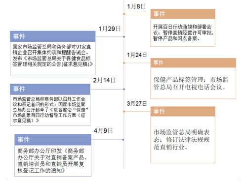 从表1和图1,全国范围内政府实施和开展的“百日行动”监管情况和主要事件时间轴可见,自2019年1月8日国家市场监督管理总局等13个部门在全国范围内集中开展为期100天的联合整治“保健”市场乱象百日行动以来,政府对直销行业进行了一系列的经营监管调整措施和集体约谈告诫会议,并且对“保健”行业制定了若干管理规定和百日行动工作通知、方案。可以看出政府对“保健”市场重点行业、重点领域、重点行为的事中事后监管和加大监督抽检力度,依法严厉打击虚假宣传、虚假广告、制售假冒伪劣产品等扰乱市场秩序、欺诈消费者等各类违法行为,以此整治“保健”市场乱象行动促进相关行业持续健康发展。