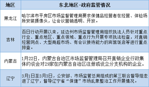 从表2,“百日行动”期间东部地区政府监管方向情况中,黑龙江和吉林两个省市主要以开展专项执法行动为主,对重点区域进行排查,而内蒙古则是召开直销企业行政集体约谈会议,进行对行业协会、行业内重点企业进行警示提醒,督促开展行业自查为主要形式。辽宁则积极开展百日行动督导工作,督导辽宁“保健”市场乱象整治工作开展情况。