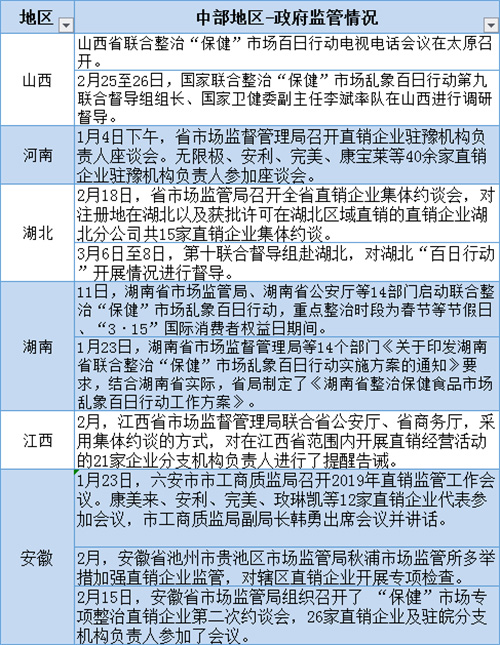 从表4,我们可以看出山西、河南、湖南和湖北等中部地区,政府在“百日行动”期间对“保健”市场重点行业、重点领域、重点行为的监管行动情况,安徽政府监管行动最多,为3件。其次湖南、湖北和山西各有2件。而江西监管行动为1件。