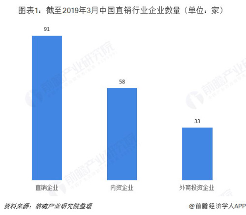2005年9月,《直销管理条例》和《禁止传销条例》正式出台,意味着直销行业进入法定直销阶段,直销行业的牌照由商务部发放。截至2019年3月,根据商务部数据,中国有91家企业拿到了直销经营许可证。其中,内资企业58家,外商投资企业33家。