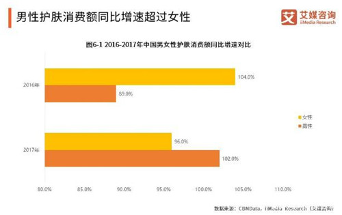 报告对2016-2017年中国男女性护肤消费额同比增速进行了对比,结果显示,2016年中国男性护肤消费额同比增速为89%,而2017则增至102.0%超过女性。