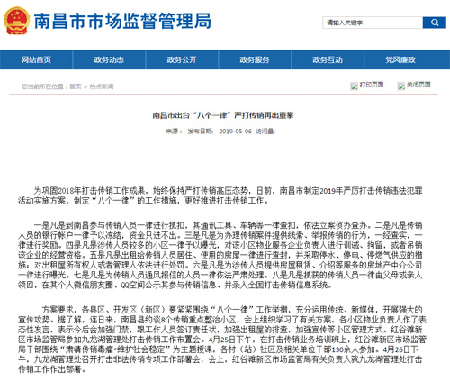 为巩固2018年打击传销工作成果,始终保持严打传销高压态势,日前,南昌市制定2019年严厉打击传销违法犯罪活动实施方案,制定“八个一律”的工作措施,更好推进打击传销工作。