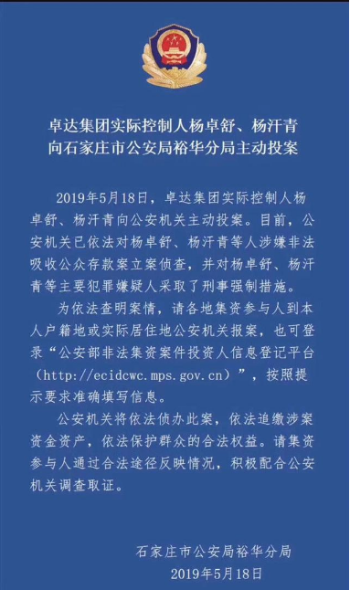 5月18日,石家庄市公安局裕华分局公告称,卓达集团实际控制人杨卓舒、杨汗青向公安机关主动投案,涉嫌非法吸收公众存款,目前已被采取刑事强制措施。