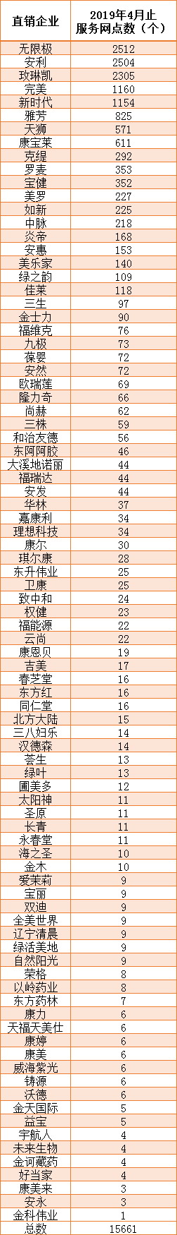 截止2019年4月30日,直销大数据研究中心根据国家商务部行业管理的官网数据统计得出,我国共有91家企业取得了直销经营许可证,共有15669个批准的直销企业服务网点,其中无限极、安利、玫琳凯、完美、新时代的服务网点均超过1000个,服务网点数量在100个以上的直销企业共有19家,占比约20%。详情如下表1: