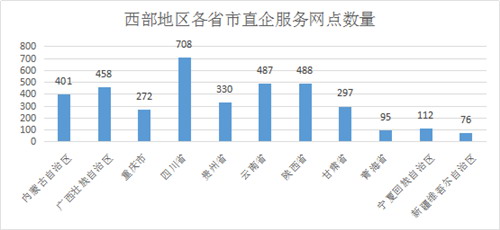 如图3,西部地区分布的直销企业服务网点最多的省市是四川省,而内蒙古、广西、云南和陕西地区的服务网点总数相差不多。重庆、贵州和甘肃地区均分别有13家直企布局服务网点;有19家直企在内蒙古设立了服务网点;有14家直企在广西设立了服务网点;有20家直企在四川布局服务网点;而有15家直企在云南地区布局了服务网点;有18家直企在陕西设立服务网点,而青海省、宁夏和新疆地区仅分别有7家、10家和3家直企设立服务网点。值得注意的是西部地区的西藏地区目前还未有直企设立服务网点。其中无限极、安利、玫琳凯、完美、新时代、雅芳、康宝莱和天狮在西部地区各省市共布局服务网点均超过了100家。