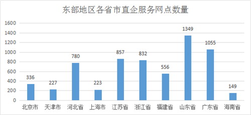 如图4,东部地区分布的直销企业服务网点较多的省市有山东省、广东省、江苏省、浙江省和河北省。从数据上看,天津、北京、河北地区都分别有21家直企布局服务网点;江苏省和浙江省都分别有23家直企设立了服务网点;山东省和广东省是直销大省,分别有40家直企和32家直企布局了服务网点,其服务网点的总数也是名列全国各省市服务网点总数的前两名;有19家直企在福建省设立了服务网点;而仅有10家直企在海南省布局服务网点。在东部地区布局服务网点个数超过100个的有14个直企,分别有无限极、安利、玫琳凯、完美、新时代、雅芳、康宝莱、天狮、罗麦、宝健、克缇、美罗、如新和中脉。
