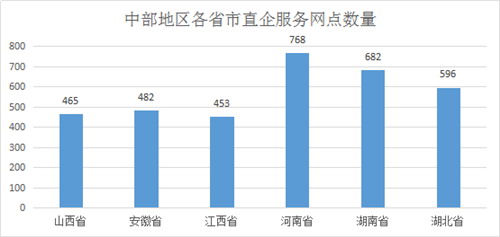 如图5,东部地区分布的直销企业服务网点数量前三名的有河南、湖南和湖北。从数据上看,安徽省和江西省都分别有15家直企布局服务网点;湖北省和河南省都分别有17家直企设立服务网点;有16家直企在山西省布局服务网点;有19家直企在湖南省设立了服务网点。其中无限极、安利、玫琳凯、完美、新时代、雅芳、康宝莱、天狮和炎帝在中部地区共布局服务网点均超过了100家。