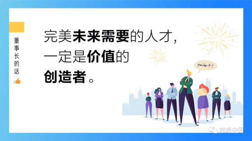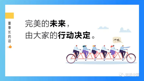 完美正在以全新的姿态走进25周年,我们憧憬美好的未来,公司也有信心带大家开启一个新的世界,创造新的未来,前提是我们自己必须有所改变。至少,是改变我们自己眼中的世界。内心有希望、有目标、有行动,才有前进的动力和价值。