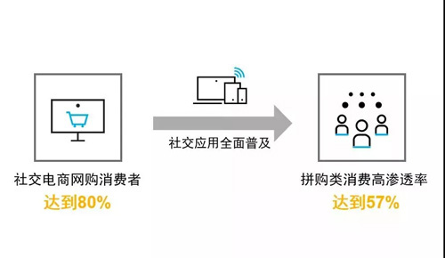 根据尼尔森《2019泛社交电商深度研究报告》报告显示,虽然传统电商渠道仍是主流的购物平台,然而使用社交电商渠道的网购消费者已达到80%,其中参与拼购类的消费人群渗透率最高,达到57%。这背后是微信等社交类应用的全面普及,使得社交媒体逐渐占据人们在手机上大量使用时长,利用社交关系及个人影响力的社交流量红利涌现。
