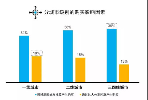 进一步来看,三线城市更多信赖身边好友推荐,而一二线城市更容易受到达人/KOL种草的影响。主要原因是由于下线人群接触网络社交渠道相对较单一,相比较而言,基于周围亲朋好友的社会关系更为紧密;而一二线城市消费者的线上社交及交友渠道更加多元,所以更容易接受线上达人/KOL的推荐而产生非计划性购买。