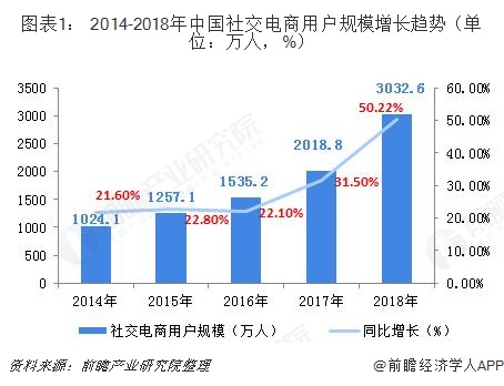 图表1: 2014-2018年中国社交电商用户规模增长趋势(单位:万人,%)