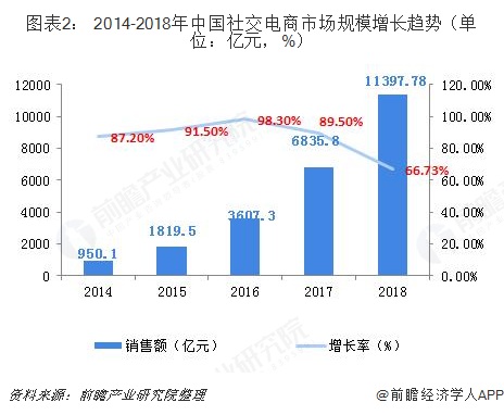 图表2: 2014-2018年中国社交电商市场规模增长趋势(单位:亿元,%)