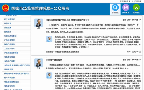 5月17日,有网友在国家市场监督管理总局网站公众留言系统举报关于商会分享经济推介会涉嫌传销的问题。举报称,5月3日至7日、5月17日至20日,有号称中国商会的组织在河北承德滦平高新技术学院组织传销活动,声称推广“一带一路”分享经济模式。组织者称不需要买产品。且活动现场有人力资源与社会保障部教育培训中心“大数据人才培训承德基地”的牌子。来参加活动的是从全国各地方拉过来的人,名头是“旅游”。举报者称其家人是从山西被拉过来的。