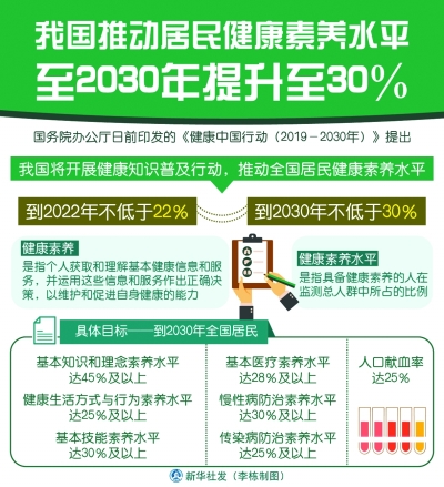 18日,一场以“健康中国·我行动”为主题的健康中国行动(2019-2030)启动仪式在京举行,引起了社会广泛关注。当前,我国居民主要健康指标总体虽优于中高收入国家平均水平,但调查显示我国居民健康素养水平总体仍比较低,关于预防疾病、早期发现、紧急救援、及时就医、合理用药、应急避险等维护健康的知识技能比较缺乏,吸烟、过量饮酒、缺乏锻炼、不合理膳食的不健康生活行为方式比较普遍。