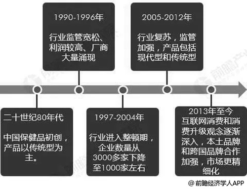 中国保健品行业发展起始于二十世纪80年代,改革开放之后,国民经济水平快速上升,人们对于保健品的需求有所上升。由于中国固有的中医保健思想,这一时期的保健品以传统保健型为主。