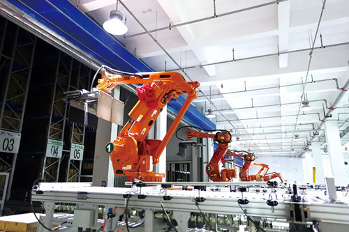 (新时代健康产业园物流中心引入了码垛机器人,可同时码放10种产品,每小时可码放400箱货物。)