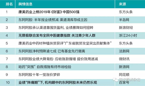 而从非敏感舆情来看,康美药业上榜2019年《财富》中国500强的新闻,成为本月最受关注的非敏感舆情;康美药业中药材种植扶贫获评“广东省脱贫攻坚突出贡献集体”,也进入了最受关注的行业舆情信息,这一定程度上缓解了康美药业目前所遇到的经营困难。