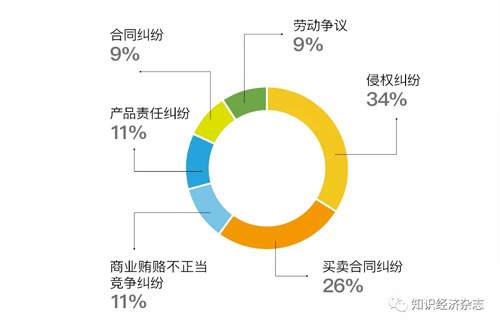 按照案件分类,侵权纠纷类案件最多,占比34%;其次是买卖合同纠纷,占比26%;然后是商业贿赂不正当竞争纠纷和产品责任纠纷,分别占比11%;最后是合同纠纷和劳动争议,分别占比9%(见图表10)。