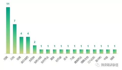 具体到企业,完美、云尚、佳莱、金日制药涉及到的案件数量较多(见图表11)。完美涉及到的案件有11起,其中作为被告的3起全部被驳回,作为原告的8起,有2起胜诉,6起撤回。吉林云尚涉及到的案件有7起,其中,作为被告的4起有2起判决、2起撤诉,另外还有3起案件成为被执行人。此外,好当家、东升伟业分别一次成为被执行人。
