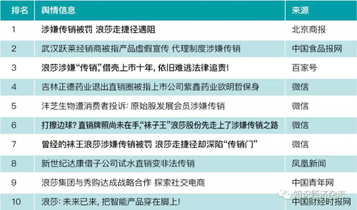 申牌企业舆情中,敏感信息较多,在7月最受关注申牌企业舆情信息排行Top10(见图表13)中,大部分为敏感信息,其中浪莎涉嫌传销的信息占据很大一部分。此外,武汉跃莱、吉林正德药业、新世纪达康、沣芝生物等企业的敏感舆情也进入了排行榜。