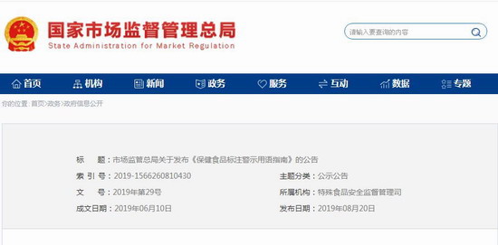 为指导保健食品警示用语标注,使消费者更易于区分保健食品与普通食品、药品,引导消费者理性消费,市场监管总局组织编制了《保健食品标注警示用语指南》。现予发布,自2020年1月1日起实施。