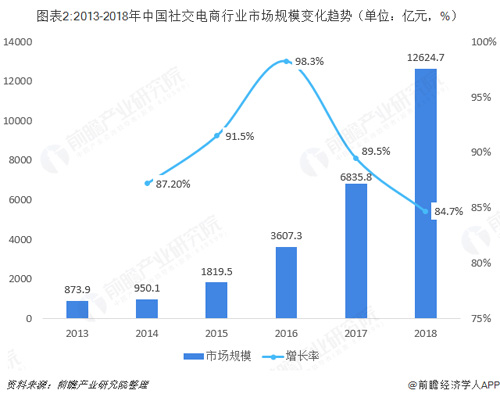 社交电商,一种在网络平台上通过对商品内容的分享传播引导用户进行消费的新型业态模式,近几年风头强劲。“互联网+”的浪潮下,“社交+电子商务”凭借较强黏性、互动性、精确用户细分与巨大商业潜力以及较低营销、时间成本迅速发展起来,2018年我国社交电商行业市场规模达到12624.7亿元,较2017年同比增长84.7%。