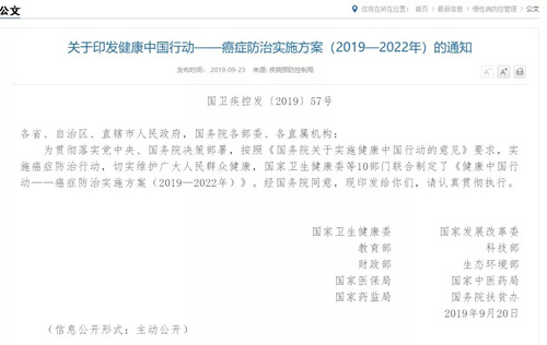 9月23日,国家卫健委等多部委联合印发《健康中国行动——癌症防治实施方案(2019—2022年)》。