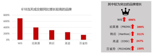 电商平台的作用究竟有多强劲,数据无疑最具有说服力。今年6·18期间,在京东平台上,14个国货美妆品牌成交额同比增长100%以上,同比增长最高的品牌超696%。其中,WIS、珀莱雅、百雀羚、高姿等国产品牌均实现高速增长。
