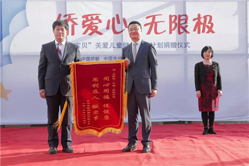 中国侨联刘景春副部长为无限极(中国)有限公司高级副总裁黄健龙赠送锦旗