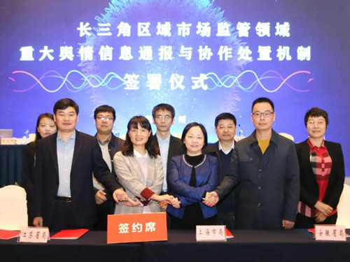 为进一步提升长三角区域市场监管舆情处置与应急管理协作水平,为长三角区域市场监管工作营造良好环境,按照《长三角地区市场体系一体化建设合作备忘录》总体框架和局长联席会议有关要求,11月22日,上海、江苏、浙江、安徽市场监管局在江苏徐州共同签署《长三角区域市场监管领域重大舆情信息通报与协作处置协议》。