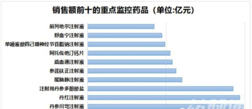 在销售额排名前十的重点监控药品中,中药注射剂占了七席,其中,丹参川芎嗪注射液、丹红注射液、注射用丹参多酚酸盐居前三。丹参川芎嗪注射液:主要成分为盐酸川芎嗪、丹参素,适应症为闭塞性脑血管疾病,有两家企业生产,分别是吉林四长制药与贵州拜特制药。