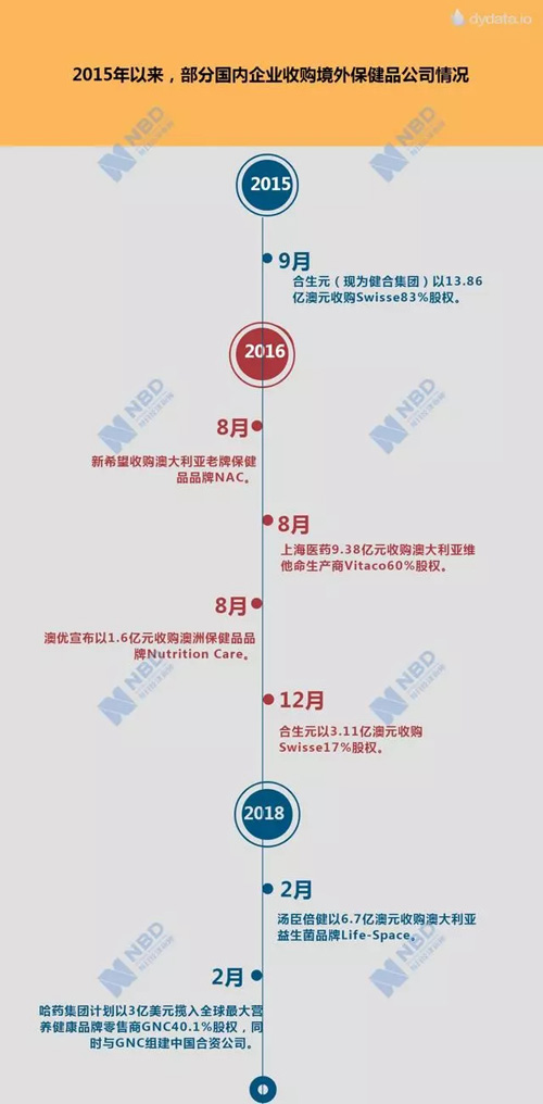 这也引得国内各大药企、乳制品企业纷纷瞄准保健品市场,在境外掀起一轮并购潮。国内某上市公司高管曾对记者坦言,询价时都是中国企业在相互竞争,都希望通过并购海外企业获得庞大的市场。《每日经济新闻》记者不完全统计发现,2015年以来,合生元(现更名为健合集团)全资收购Swisse100%股权之后,新希望宣布收购澳大利亚老牌保健品品牌ANC,随后上海医药以9.38亿元收购澳大利亚维他命生产商Vitaco 60%股权,澳优宣布以1.6亿元总价收购澳洲保健品品牌Nutrition Care,汤臣倍健以6.7亿澳元收购澳大利亚益生菌品牌Life-Space。2018年,哈药集团计划以3亿美元获得全球最大健康营养品牌零售商GNC40.1%股份,同时与GNC组建中国合资公司,并在今年2月如愿以偿。