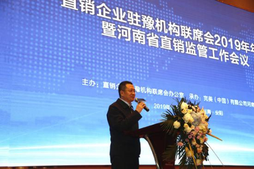 2019年12月19-20日,河南省直销企业驻豫机构联席会议(以下简称联席会议)2019年年会暨河南省规范直销与打击传销工作会议在安阳市举行,国家市场监督管理总局价格监督检查和反不正当竞争局处长职向阳、河南省市场监督管理局副巡视员李东升、河南省规范直销与打击传销办公室主任刘锋、副主任侯立宁,全省十八地市及省直管县(市)市场监督管理局主管局长、规直打传工作负责人、马来西亚直销协会(DSAM)总裁和联席会议40多家成员单位,近150人出席会议。会议由联席会议2019年轮值主席完美(中国)有限公司河南分公司(以下简称完美河南分公司)承办。