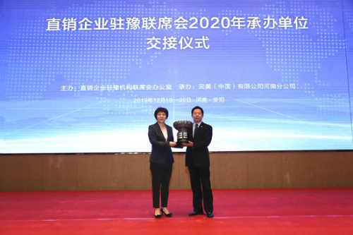 2019年直销企业驻豫机构积极履行社会责任,河南省市场监督管理局李东升副巡视员、河南省规范直销与打击传销办公室刘锋主任为完美(中国)有限公司河南分公司等13家直销企业颁发了2019年履行社会责任突出贡献奖。