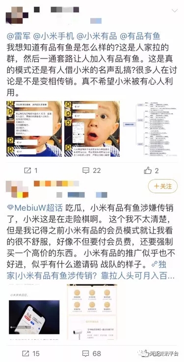 这样的方式很容易就让人联想到“入门费”、“发展下线”,一时间有品有鱼佛系推手团涉嫌传销等言论便流传开来,而所谓运营团队佛系推手团在对外邀请他人加入时,都会首先使用小米品牌作为强有力的支撑。