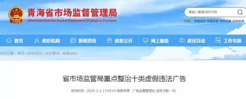 2020年1月2日,为营造良好和谐的广告社会氛围,保障全省人民群众度过祥和的“元旦、春节”。青海省市场监管局广告监管工作围绕打好“开局牌”,针对药品、保健食品、医疗、美容服务、旅游服务、教育培训、房地产、金融投资理财广告等关系人民群众健康安全和财产安全重点领域,从10个方面着手严厉查处社会反映强烈的广告违法行为。