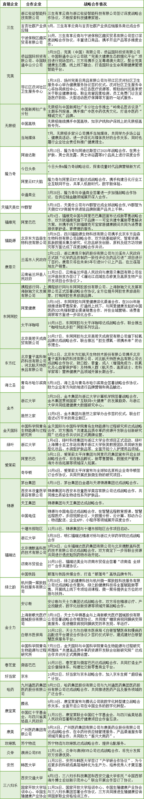 企业在发展自身优势的同时,也会同其他合作伙伴达成战略合作,做到优势互补,将自身企业提升到新的高度,如产品研发技术的提升、新产业的布局及学习双方的特色资源等。2019年直销大数据研究中心收集整理到多个企业均与其他企业或校企达成了合作,详情如表1: