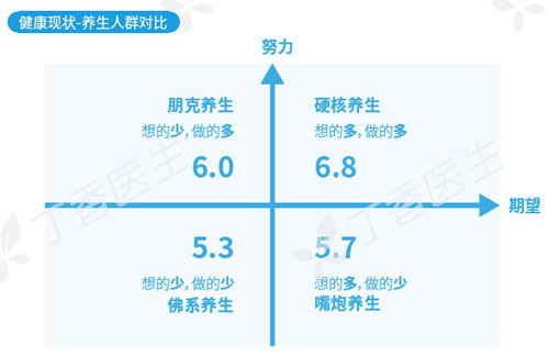 为了更好地了解健康目标设立对个人健康状态提升的影响,丁香医生从“设立目标”和“行动实操”两个维度将受访者分为了四类人群——硬核养生(既立目标,又踏实行动)、朋克养生(不立目标,直接行动)、佛系养生(不立目标,也不太行动)以及嘴炮养生(只立目标,不太行动)。对比四类人群发现,“硬核养生”人群理所当然最容易达成良好的健康状态。“朋克养生”和“佛系养生”人群尽管是对健康都没有什么期待和要求的两群人,但默默努力的“朋克养生”人群各项健康状态均优于不想不干的“佛系养生”人群。
