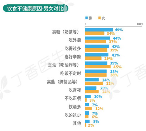 《报告》显示,99%的人对合理饮食都有要求,然而奶茶、蛋糕等高糖食品,是所有体重区间的人都难以避开的陷阱,其次是外卖。48%的人认为饮食不健康的来源是奶茶等高糖食物。相比女生,男生更能拒绝奶茶的诱惑,但仍有49%的男生一周至少一杯奶茶。在女生群体,一周至少一杯奶茶的人群占62%。