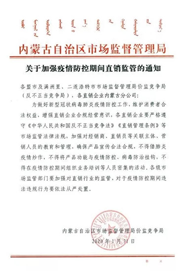通知要求,各直销企业内蒙古分公司要严格遵守直销监管法律法规,加强对经销商、直销员等关联主体、营销人员的教育管理,确保产品宣传合法合规,不得借新型冠状病毒感染肺炎疫情炒作,不得将产品功能与疫情防控、病毒防治挂钩,不得在疫情防控期间组织业务培训等人员密集的活动。同时要做好售后服务,严格执行退换货制度,妥善处理投诉举报和舆情信息。