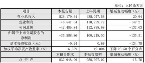 据了解,报告期内,公司实现营业总收入为526,179.94万元,较上年同期增长20.94%;营业利润为-46,541.64万元,较上年同期下降142.21%;利润总额为-42,486.84万元,较上年同期下降137.63%;归属于上市公司股东的净利润为-35,588.96万元,较上年同期下降135.51%;基本每股收益为-0.24元,较上年同期下降134.78%;加权平均净资产收益率-6.50%,较上年同期下降25.50个百分点。