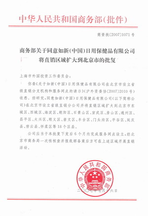 批复中写到,商务部同意如新(中国)在北京市设立省级直销分公司,并将直销区域扩大到北京市东城区、西城区、海淀区、朝阳区、石景山区、宣武区、房山区、通州区、昌平区、大兴区、顺义区、崇文区、丰台区、门头沟区、平谷区、延庆县、密云县、怀柔区等18个区县。据悉,如新(中国)是目前获得直销牌照的外资企业之一,去年获准在上海地区开展直销业务。