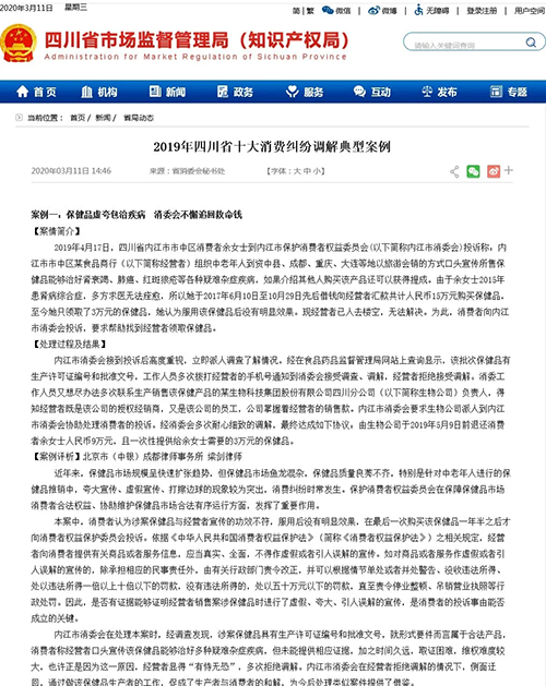 不过案例的题目为“保健品虚夸包治疾病 消委会不懈追回救命钱”,又作为典型案例挂到了四川省局的官网上,不免让行业人觉得有点委屈。
